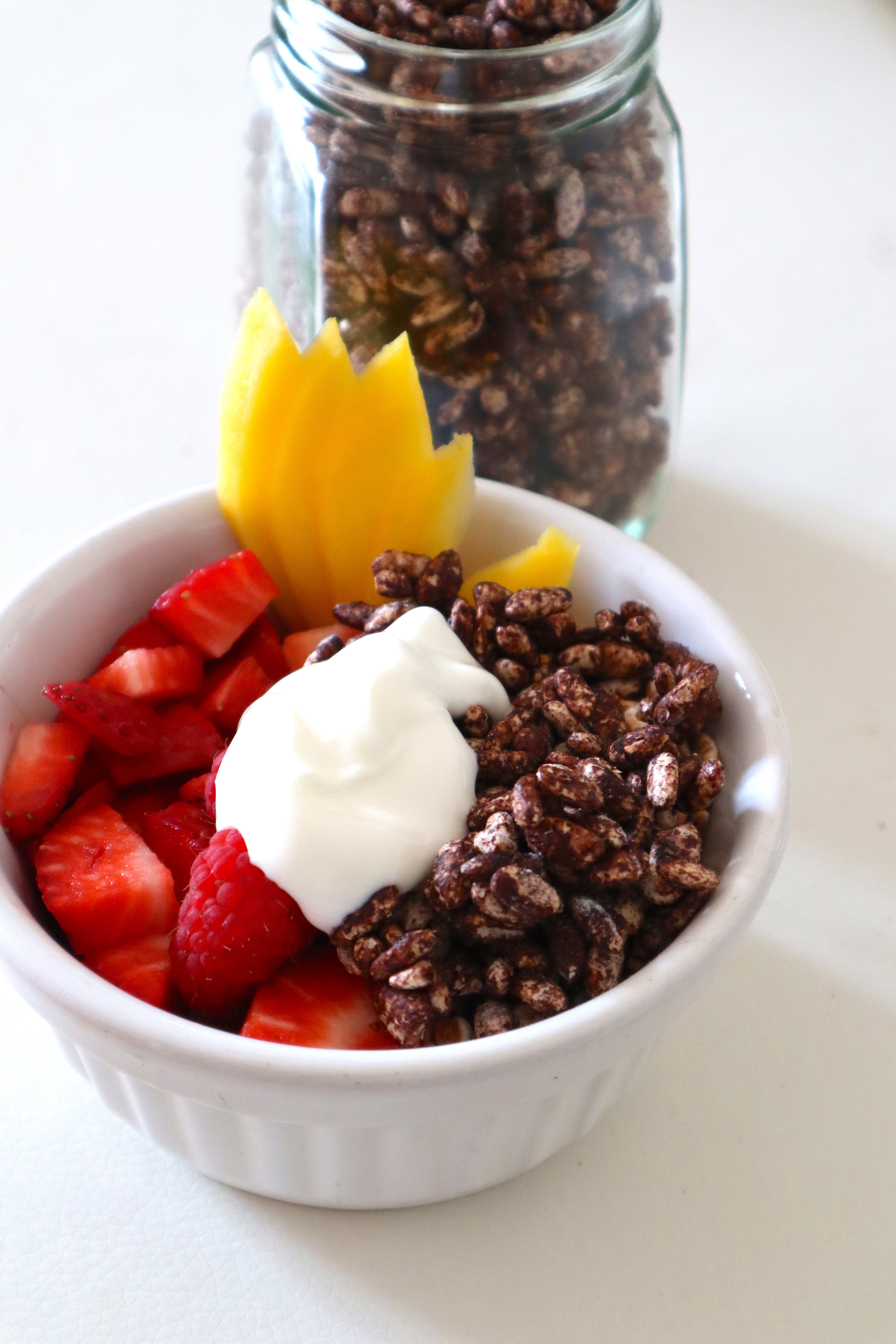 We will get to the recipe soon, but first I want to give you a quick breakfast idea (Photo above): Greek yogurt, strawberries, raspberries, mango, oats and our delicious choco crispy puffed rice! Yummy!